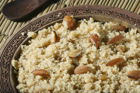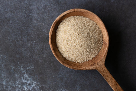 Raw Couscous in a wooden spoon on the brown background