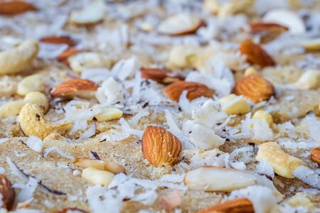 Closeup of homemade Semolona sweets well deocrated with almond, cashew and coconut rub toppings. Also known as Suji ka halwa in India