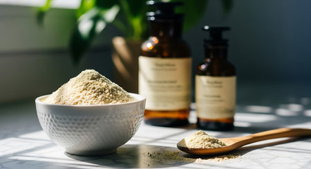 Cosmetic powder pile in bowl with bottles on blurred background. Natural powder used in beauty product. Organic beauty treatment ingredient for skin.