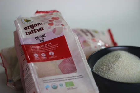 Mumbai, Maharashtra, India, March 07 2021: Granulated wheat or otherwise known as semolina in a red packaging by Organic Tattva from India. It is commonly known as rawa or sooji in India