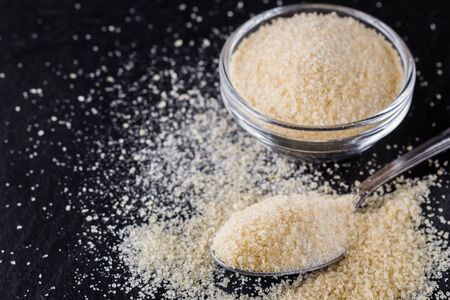 Brown Demerara Sugar in a Bowl on a black background, side view. copyspace.