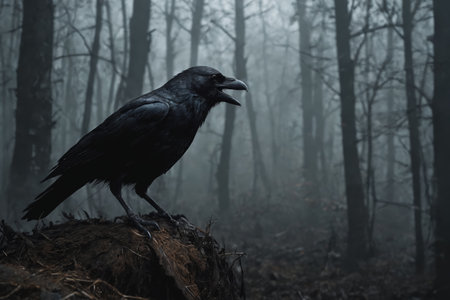 A striking image of a raven perched on a branch in a foggy forest, calling out amidst a serene winter landscape. The mist envelops the scene, creating an air of mystery.