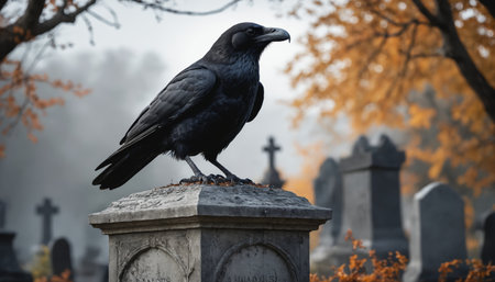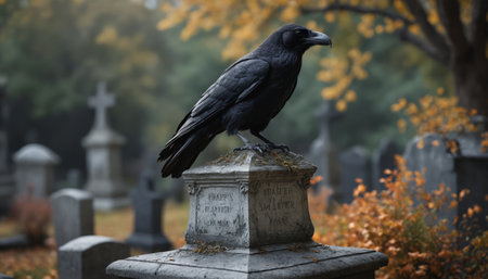 In a tranquil graveyard, a lone raven stands watch on a moss-covered tombstone, framed by vibrant autumn foliage and misty morning light, creating an atmosphere of mystery.