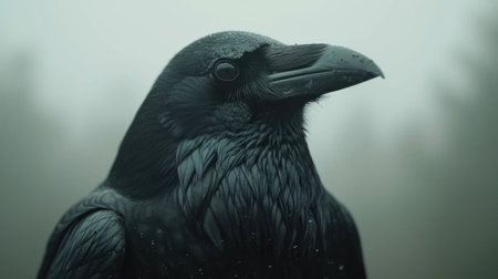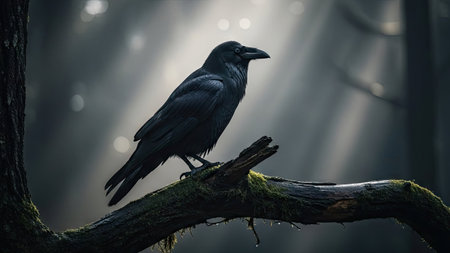 A dark raven rests on a mossy branch in a misty forest scene. The bird's black feathers contrast with the soft, diffused light filtering through the trees. The image showcases a natural environment with a shallow depth of field, suitable for editorial and commercial use, such as nature or wildlife projects.