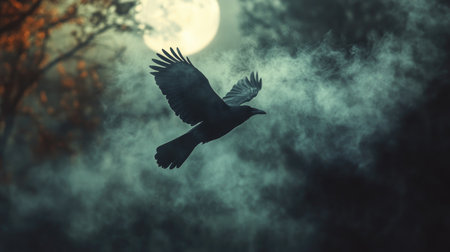 A black crow flying through smoke in a haunted forest, with the full moon casting an ominous glow.