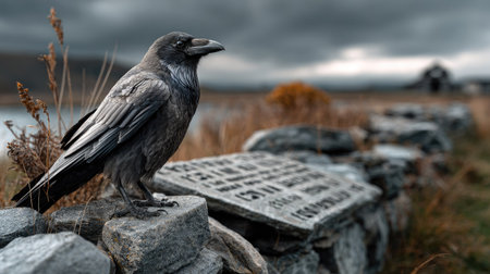 A striking raven perches on a stone wall, overlooking a dramatic landscape. The moody sky adds an eerie ambiance to this serene outdoor scene.