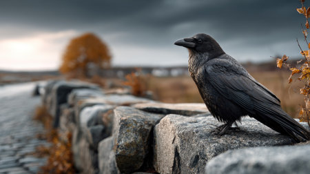 A solitary raven rests on a stone wall, set against a dramatic cloudy sky and autumn landscape near a waterbody. The serene scene captures nature's beauty and tranquility.