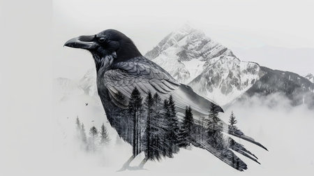 Majestic raven double exposure with misty mountains and forest