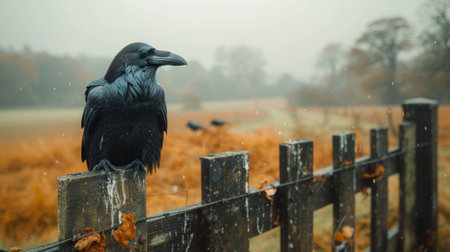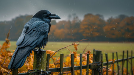 A raven sits on a fence on a gloomy November day against a stormy sky. Countryside, fields, forest on the horizon. Gloomy tones, storm. Light fog.
