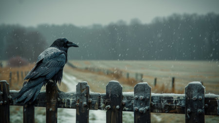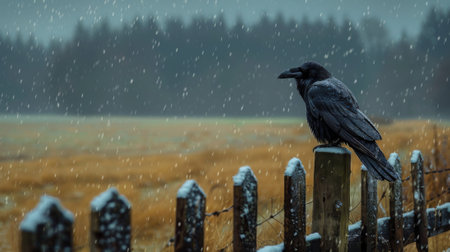 A raven sits on a fence on a gloomy winter day against a stormy sky. Countryside, fields, forest on the horizon. mystical forest. gothic aesthetic.