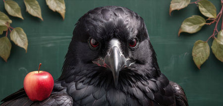 Black raven with red apple on green chalkboard background. Close up.