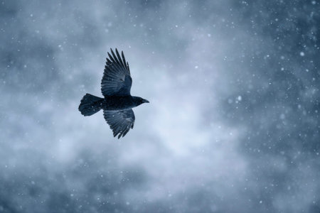 A bird glides gracefully through heavy snowfall, contrasting against a dark, cloudy sky. Flakes swirl around as winter chill envelops the scene, creating a serene yet powerful atmosphere.