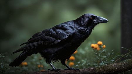 An AI generated illustration of A black crow in the forest on the blurred background