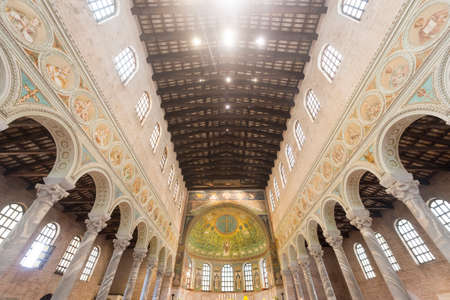 Ravenna, Italy - Sept 11, 2019: Mosaics on the side wall in Basilica of St Apollinare Nuovo in Ravenna, Italy