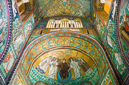Ravenna, Italy - May 12, 2013: Rich decorated with mosaic walls and ceiling of the Basilica di San Vitale in Ravenna, Italy. Rare example of early Christian Byzantine art in Europe.