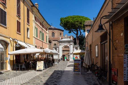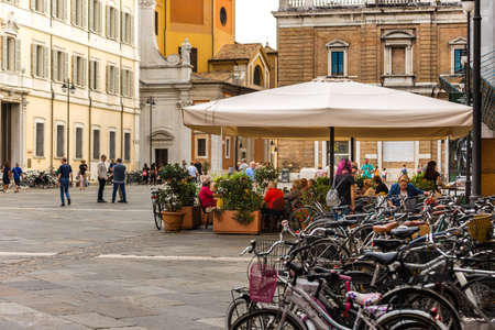 RAVENNA, ITALY - AUGUST 2, 2018: tourists are sitting in restaurants in main square in RAVENNA