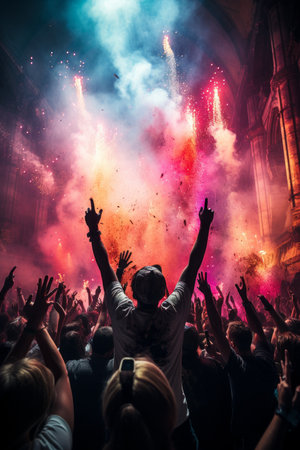Excited fans dancing in full colorful concert hall, lively atmosphere with vibrant light effects.