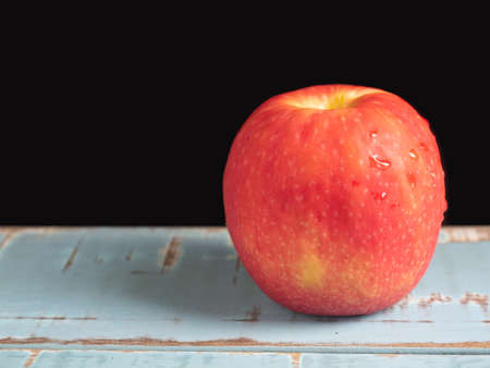 One fresh Gala apple on a black background with copy space with water drops
