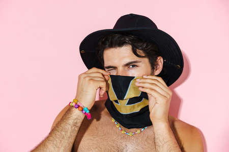 Shirtless man in hat winking while covering his face isolated over pink wall