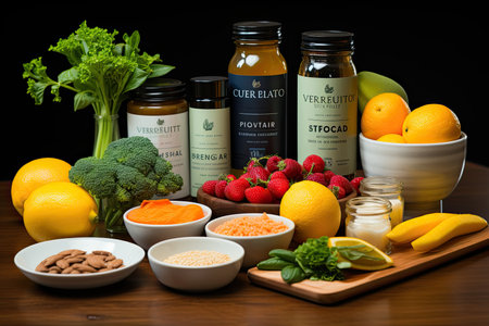 A vibrant photo showing eye-catching foods, jars of dietary supplements, berries and nuts. Learn about their nutritional properties for optimal eye health, Generative AI.