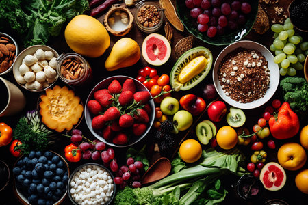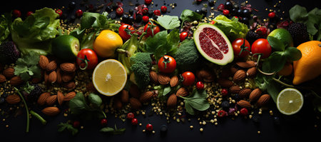 Vibrant and nutritious assortment of fresh fruits and vegetables on dark solid background