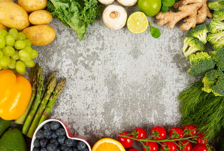 fresh fruits and vegetables arranged as frame and empty space for your text