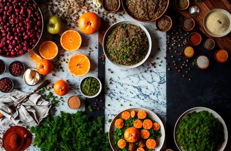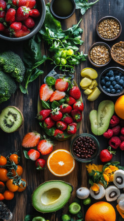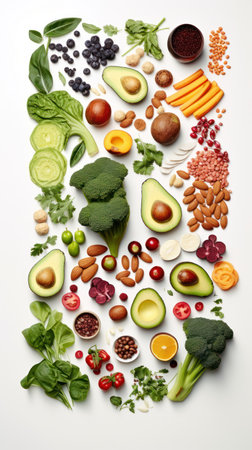 A diverse composition of nutritious food items elegantly presented in a balanced arrangement.