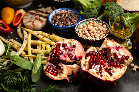 Healthy vegan food nutrition high in flavonoids, antioxidants, lycopene, anthocyanins, vitamins, proteins, bio flavonoids minerals, fibre. Vegetables, nuts, fruit, herbs, seeds, w