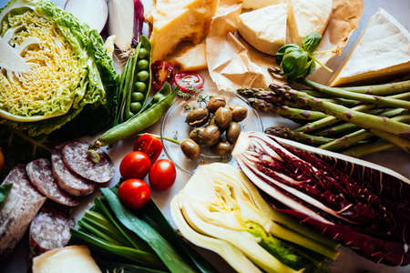 Different fresh vegetables, greens and salami sausage on the table before cooking. Healthy mediterranean eating concept.