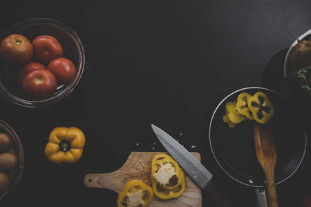 Fresh vegetables, eggs, and chopping bell pepper on black wood background. Mockup for menu or recipe