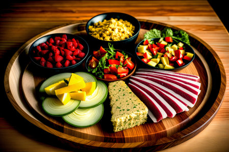 A Wooden Plate Topped With Different Types Of Food. Generative AI