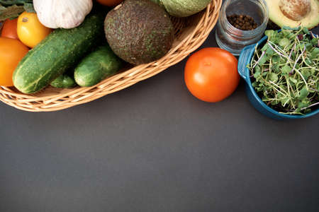 Vegetables dark background with copy space. Healthy meal. Menu, price background