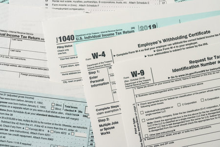 Paper blanks of 1040, w4 and w9 tax form close up
