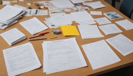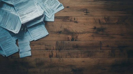 Tax documents on desk, tax season stress, financial papers, room for copy