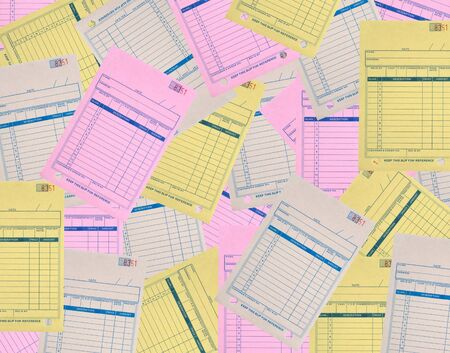 Paper cash register receipts in a lose pile close up with soft focus