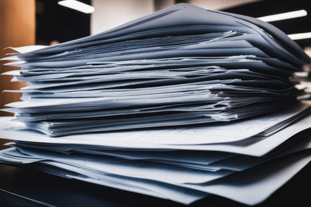 A chaotic pile of unsorted paperwork and documents rests on a wooden table, depicting an office environment filled with clutter and disarray.