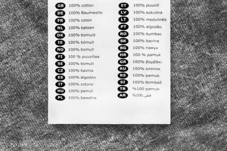 Clothing label says 100% cotton in different languages on gray fabric background