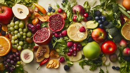 An enticing background featuring a mix of colorful fruits, vegetables, and berries, ideal for promoting healthy eating