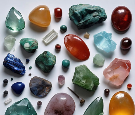 A stunning arrangement of vibrant gemstones in various colors highlights their unique shapes and natural beauty, creating a visually appealing and tranquil composition.