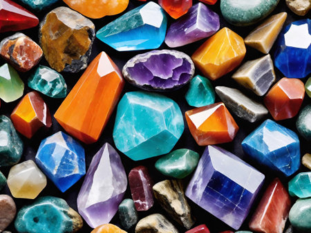 A stunning close-up view of an array of colorful precious gems and stones reflecting light. The diverse shapes and vibrant colors create a mesmerizing display, perfect for showcasing beauty in nature.