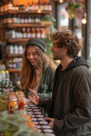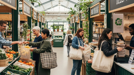 Customers buying dry goods and bulk products in plastic-free grocery stores. Conscious shopping, sustainable small businesses, minimalist lifestyle