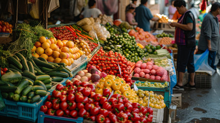 marketplace with vibrant fruits and vegetables on stalls Local farmers and customers background. AI generated