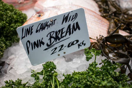 Various types of seafood for sale in the local market. Wild sea bream is the business.