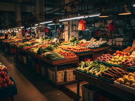 A lively urban marketplace bustling with shoppers surrounded by colorful displays of fresh vegetables and fruits, showcasing vibrant local culture.