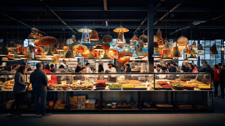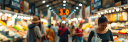 Blurred, Bustling Indoor Market Hall, Shoppers Browsing Diverse Stalls, Daytime Commerce