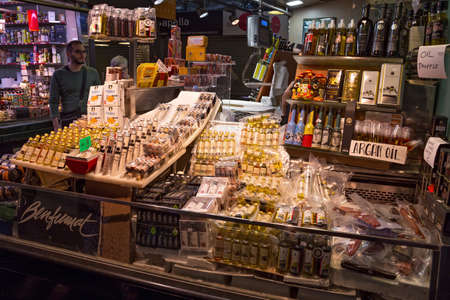 BARCELONA, SPAIN - MAY 16, 2017: Sale of different food souvenirs and gifts on the famous La Boqueria market in Barcelona.