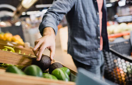 Cropped view of man taking avocado from counter in supermarket on blurred background
