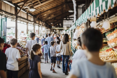 Bustling farmers market with families exploring fresh produce stalls on a vibrant sunny day.