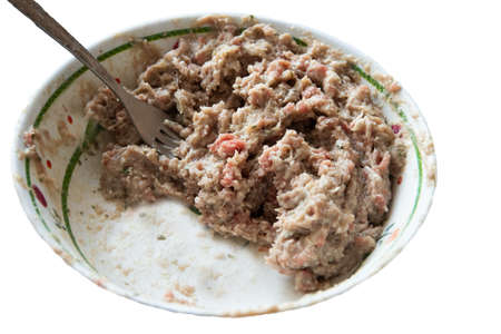 minced meat in a white plate, prepared from pork, beef, with onions and spices. Forcemeat fork. Isolate Making pies.
