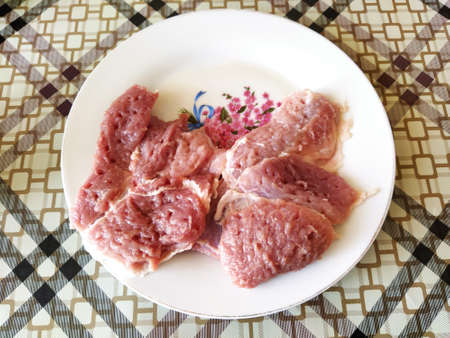 Cut off raw pork on a plate